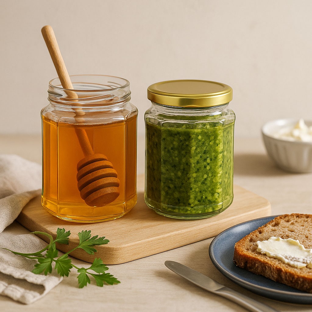 De elegante flerkantede glassene kombinerer estetisk design med praktisk funksjonalitet. Deres tolvkantede bunn gir dem et spesielt utseende og sørger samtidig for plassbesparende lagring. Produsert i Europa, imponerer de med sin høye kvalitet og allsidighet. Enten det er for aromatiske pastaer, krydrede pestoer, fruktige syltetøy eller edel honning – disse glassene tilbyr den perfekte emballasjen for ulike spesialiteter.