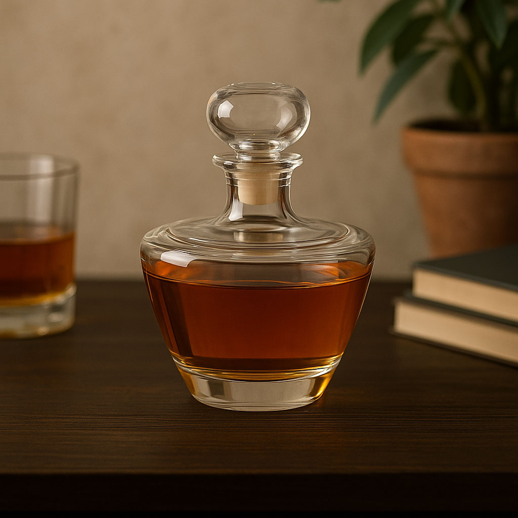 Den klare glassflasken «Homme» imponerer med sin elegante, bølgende form og et unikt design som minner om flytende bølger. Den runde grunnkroppen smalner konisk og har en trappetrinnsformet avsetning mot åpningen – en stilfull detalj som gir en spesiell visuell dybde. Denne eksklusive flasken er produsert i EU og kombinerer høy kvalitet med tidløs estetikk. Perfekt egnet for utsøkte brennevin, likører og andre spesielle drikker, fremhever den den edle karakteren til innholdet. «Homme»-flasken har en korkåpning, og passende korker er tilgjengelige i vårt sortiment.
