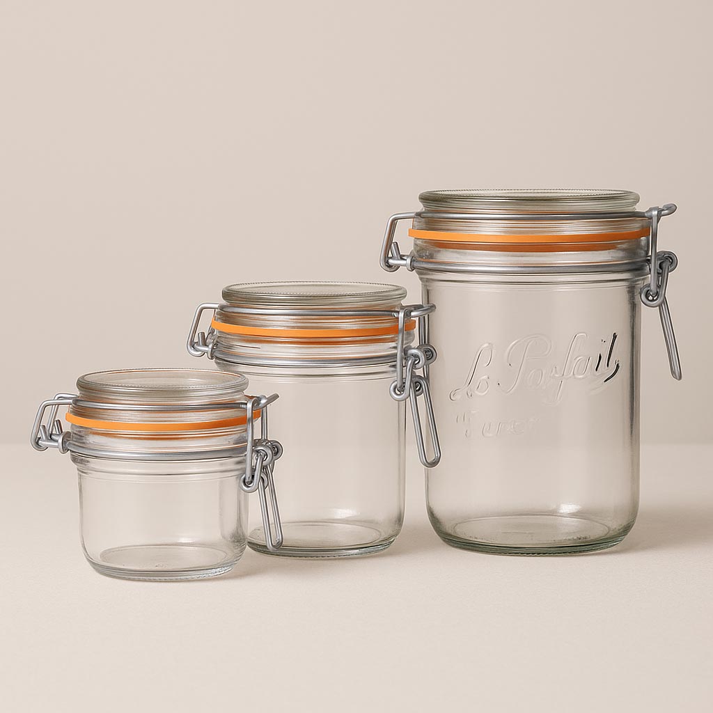 Serien "Super Terrine" fra Le Parfait står for autentisk fransk håndverk og tilbyr en førsteklasses løsning for konservering og presentasjon av matvarer. Dette klassiske trålklemglass med "Le Parfait Super"-relieff er spesielt designet som et opp-ned-glass, noe som gjør det enkelt å ta ut kaker, terter og andre desserter. Det egner seg også ideelt til syltetøy, pølse- og kjøttkonserver samt et bredt utvalg av fine pålegg. Med en kapasitet på 125 til 1000 ml tilbyr "Super Terrine" mange bruksområder. Den medfølgende glasslokket og den karakteristiske oransje gummiringen sikrer en trygg, lufttett forsegling.