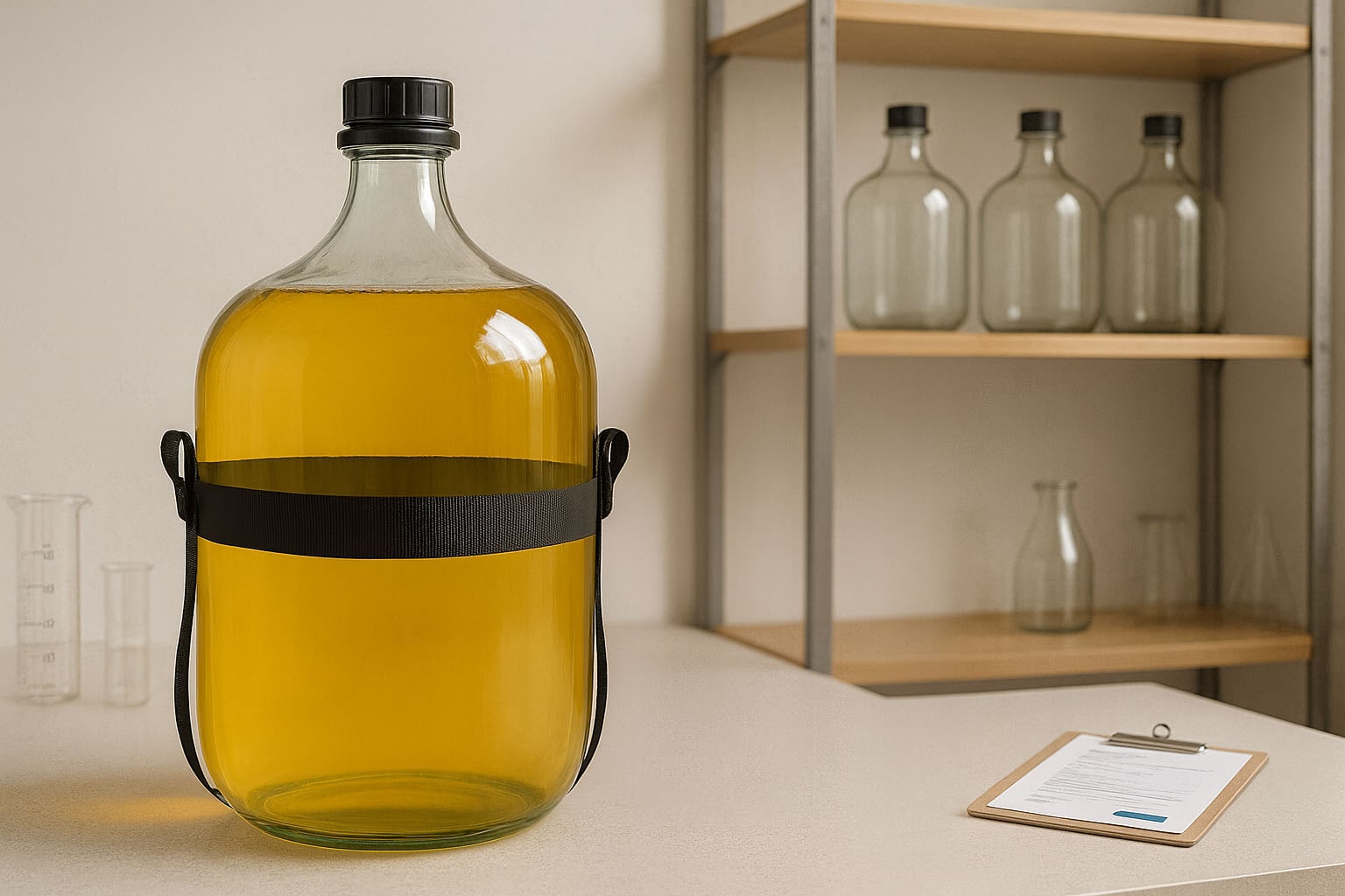 Ballongflasken „High End“ kombinerer førsteklasses utførelse med maksimal sikkerhet og funksjonalitet. Med sitt romslige volum på 25 liter tilbyr den en ideell løsning for lagring og transport av følsomme væsker. Den runde formen sørger for en jevn fordeling av innholdet, mens fallbeskyttelsespakningen med UN-godkjenning oppfyller de høyeste sikkerhetsstandardene. Den svarte originalitetsforseglingen sikrer en pålitelig lukking og beskytter mot uautorisert tilgang. I tillegg sørger 48 mm brede tekstilstropper med plastbærehåndtak for enkel håndtering, selv når flasken er full. Perfekt for sikker oppbevaring og transport av brennevin, kjemikalier eller andre sensitive væsker – ballongflasken „High End“ setter nye standarder for kvalitet og sikkerhet.